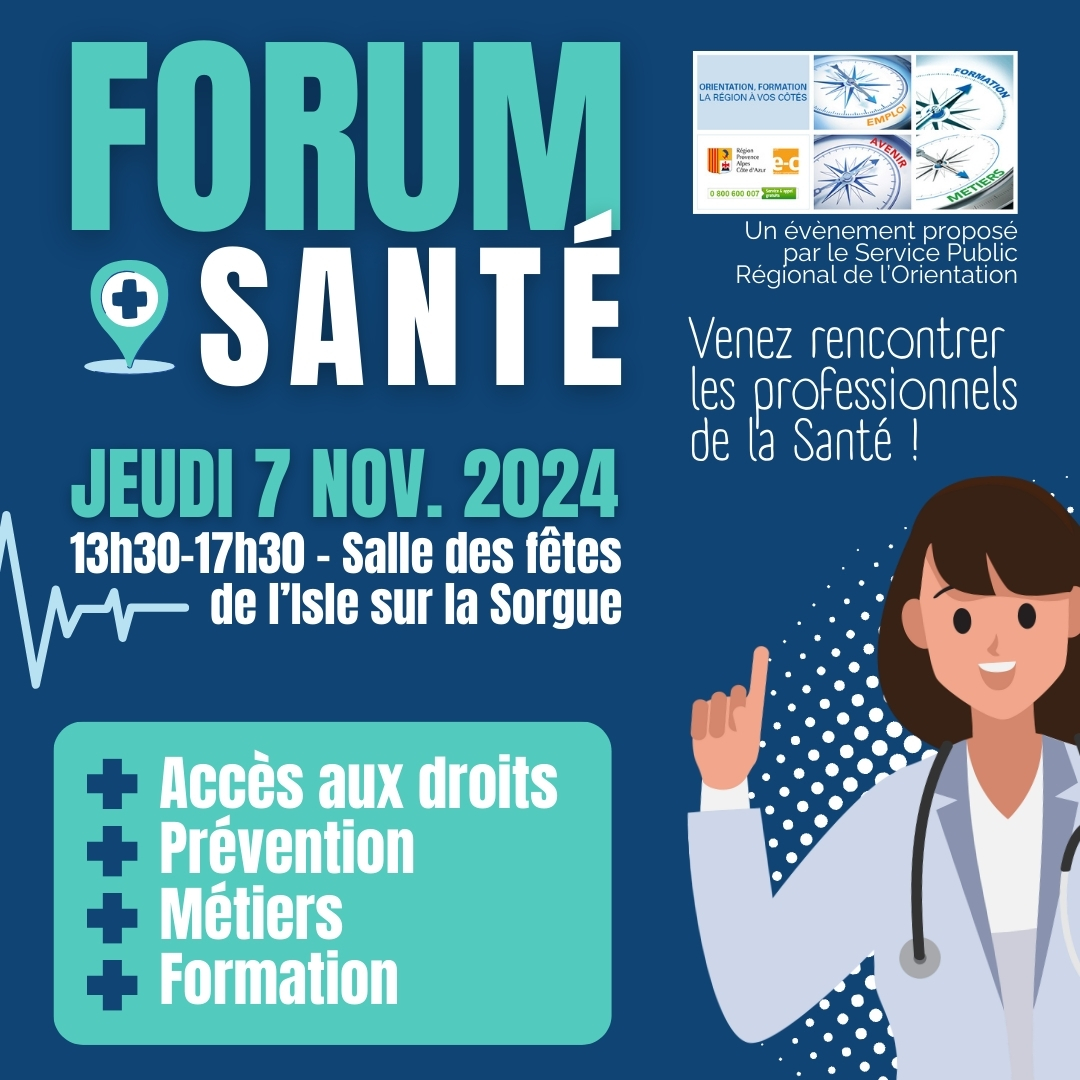 Retrouvez notre Académie au Forum Santé organisé par le Service Public Régional de l'Orientation, le jeudi 7 novembre 2024 à la salle des fêtes de L'Isle-sur-la-Sorgue.